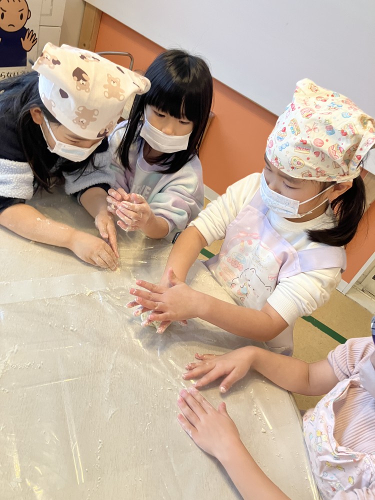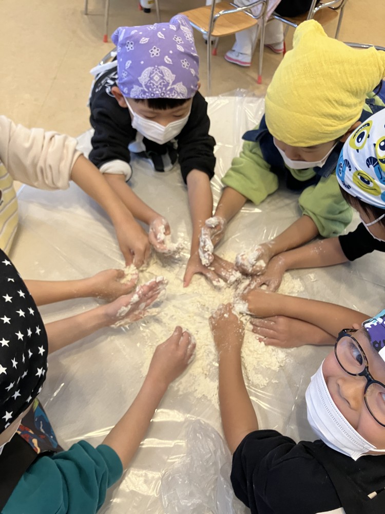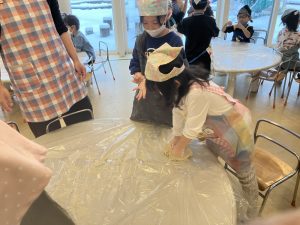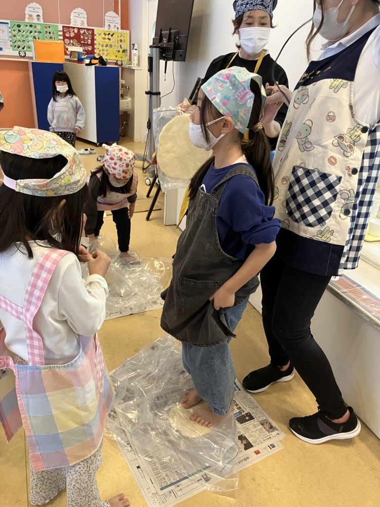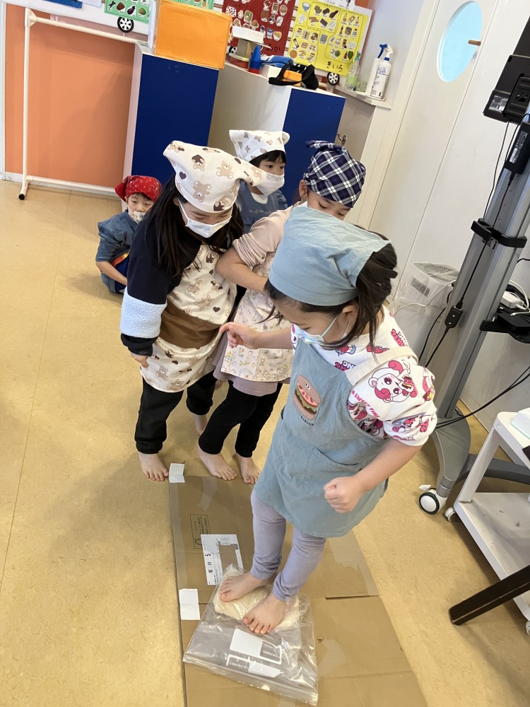 さあ、よりコシを強くするために足で踏みます!初めての経験に歓声をあげながらお友達と「10回ずつね!」とルールを決める場面も。