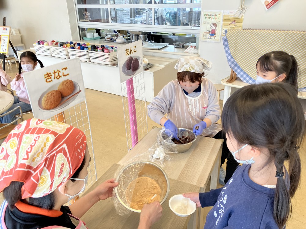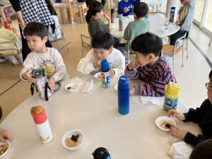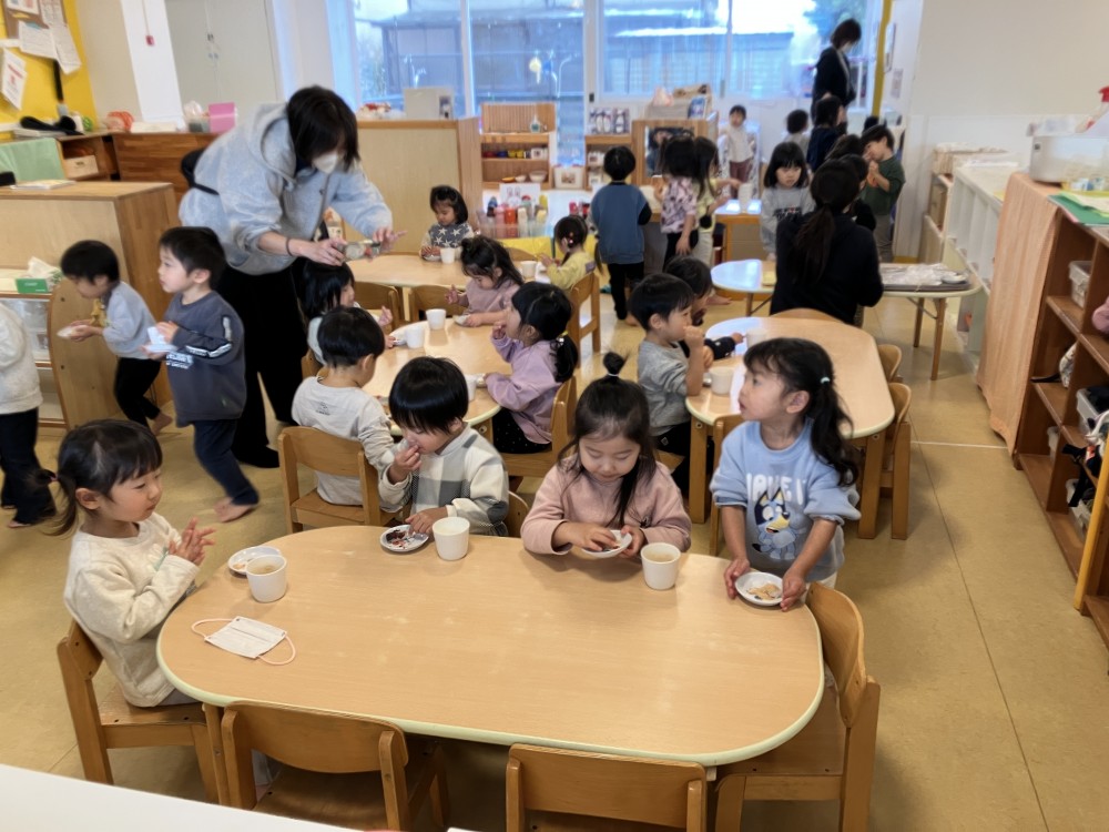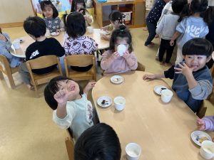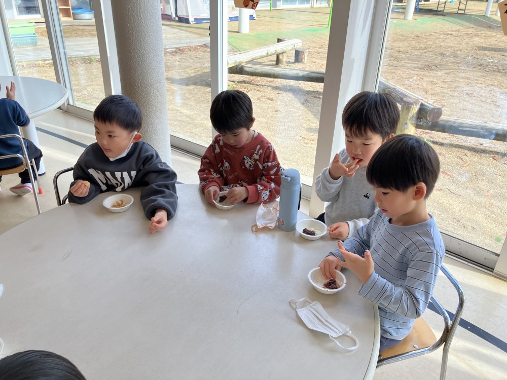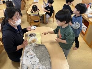 2歳児3歳児さんは、お餅を食べた経験がない子も多い事から、もち米を食べました。小さくてもちゃんときな粉かあんこか選びます!