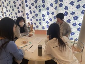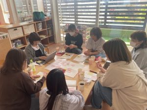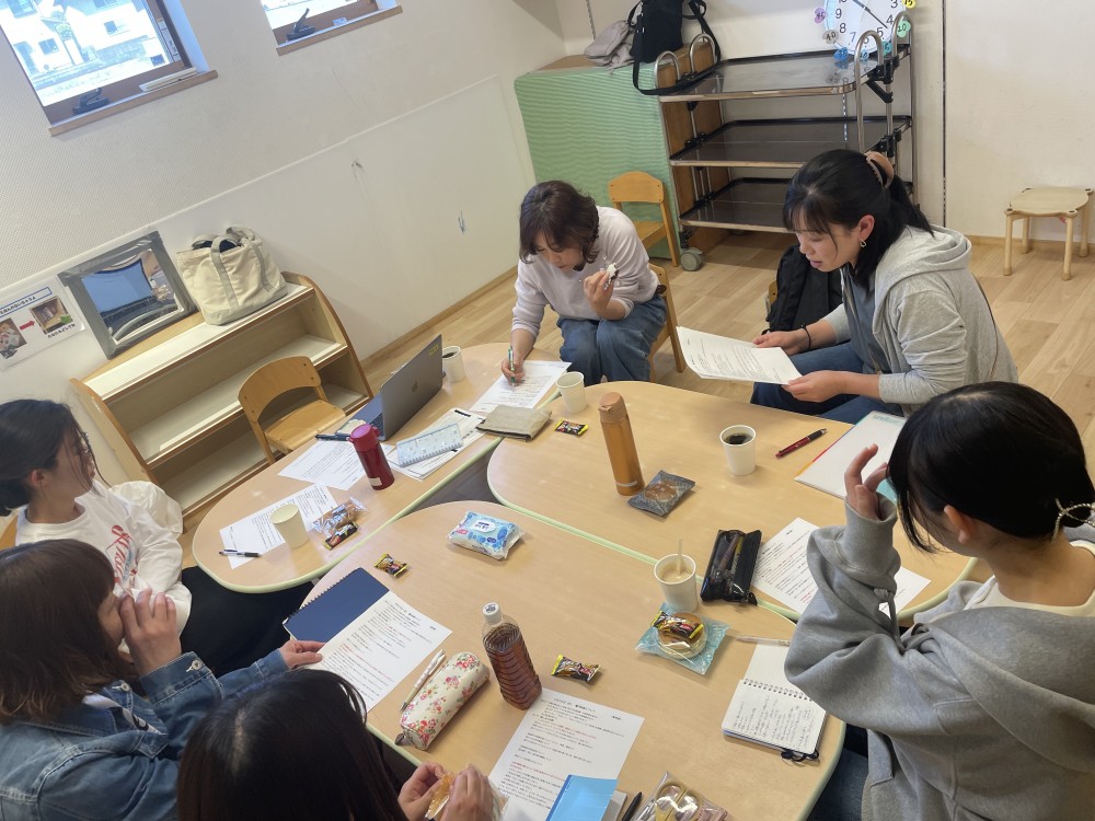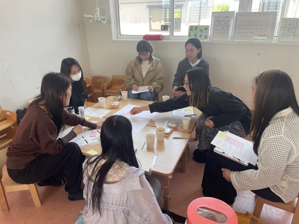 0〜1歳児、2歳児、3〜5歳児、厨房の各フロアーに分かれ、園の理念に沿った関わり方や環境構成についてテーマ別ディスカッションを行いました。